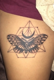 女生大腿上黑色点刺几何点线小动物蝴蝶纹身图片
