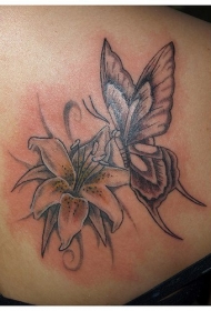 百合花与蝴蝶黑灰纹身图案