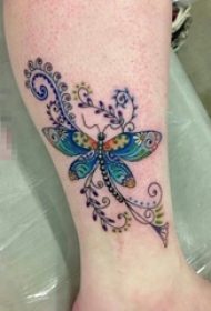 女生腿上彩绘线条匕首与蝴蝶纹身图片