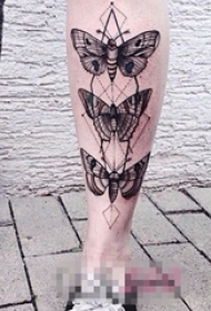 男生小腿上黑色点刺几何线条蝴蝶纹身图片