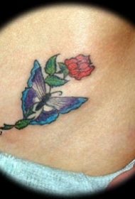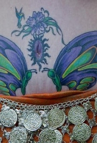 腹部美丽的蓝色和绿色花朵与蝴蝶纹身图案