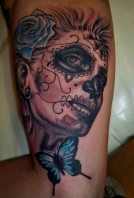 墨西哥死亡女郎和蓝色蝴蝶玫瑰纹身图案