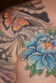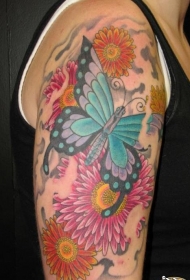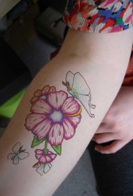 手臂可爱的粉红色花朵和蓝蝴蝶纹身图案