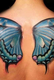 背部可爱的蓝色蝴蝶翅膀纹身图案