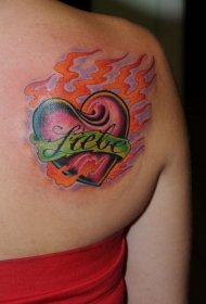 肩部彩色燃烧的心与字母纹身图案