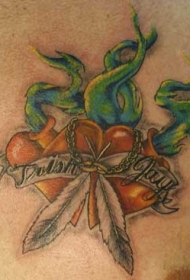 胸部彩色爱心与羽毛纹身图片