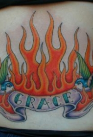 腰部彩色火焰和麻雀纹身图案