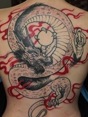 女性正背帅气的红火焰黑灰色龙纹身图片