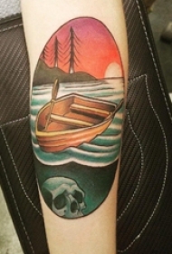 女生手臂上彩绘几何圆形水和船刺青图案图片