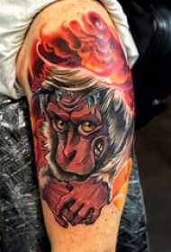 男生手臂上彩绘抽象线条云朵和动物猴子刺青图案图片