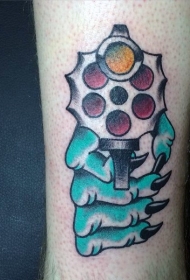 卡通风格彩色僵尸手与左轮手枪手臂纹身图案
