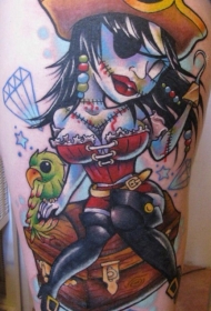 大腿卡通彩色僵尸海盗女孩与鹦鹉和钻石纹身图案