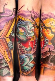 花臂卡通彩色滑稽僵尸和墓地纹身图案