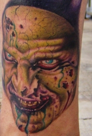 腿部彩色僵尸脸纹身图案