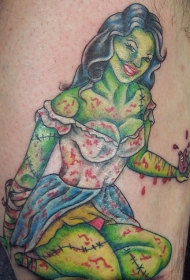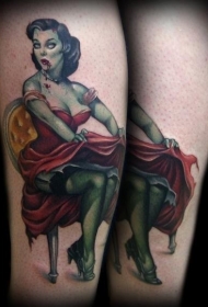 腿部彩色僵尸女郎纹身图案