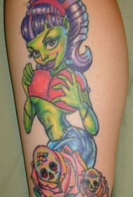 腿部彩色僵尸女孩纹身图案