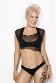 国际纹身明星 Pink大腿上黑色的龙纹身图片