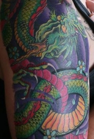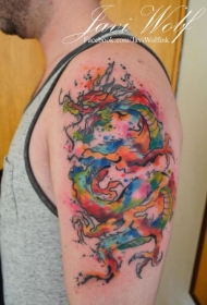 大臂彩虹色的亚洲龙水彩风格纹身图案