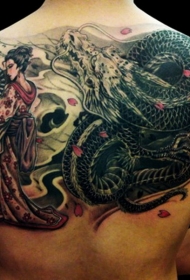 背部风景如画的彩色艺妓与龙恶魔纹身图案