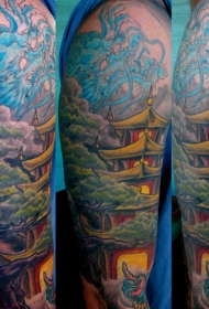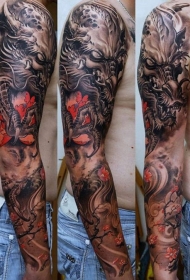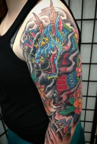半甲壮丽的五彩亚洲风格龙花朵纹身图案