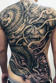 满背亚洲风格大规模黑白龙与武士面具纹身图案