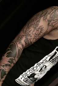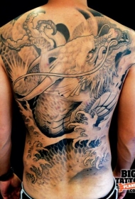 满背超级巨大的黑白亚洲龙和浪花纹身图案
