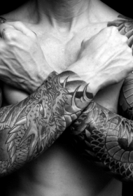 手臂巨大的五彩亚洲风格龙战斗狐狸纹身图案