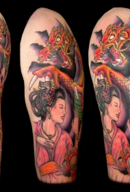 手臂old schoo丰富多彩的亚洲艺妓和龙纹身图案
