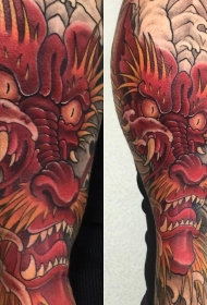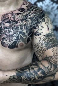 胸部和手臂大规模的彩色龙与武士面具纹身图案