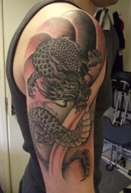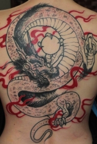 背部亚洲风格黑色龙与红色火焰纹身图案