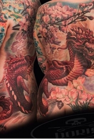 满背亚洲风格华丽的彩色龙和开花树纹身图案