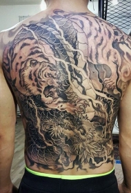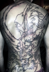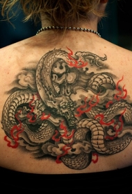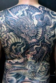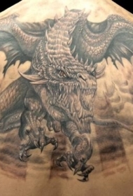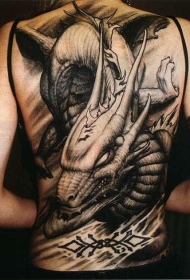 背部黑灰风格的恐怖龙与烟雾纹身图案