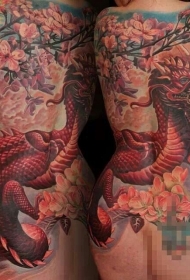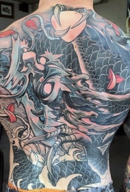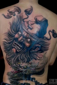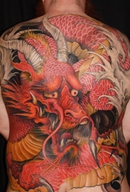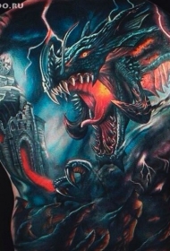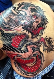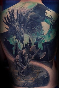 背部彩色的幻想风格邪恶龙与战士纹身图案