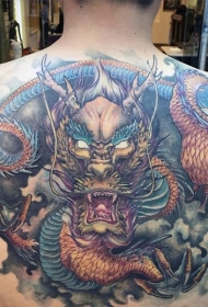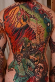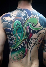 背部卡通风格彩色邪恶龙与可怕人类纹身图案