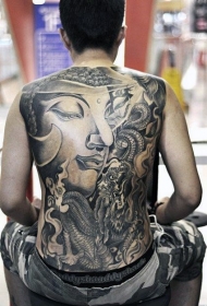 背部黑色的如来佛祖雕像和蛇纹身图案