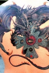 背部新风格的彩色幻想龙与铁十字架纹身图案