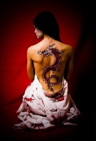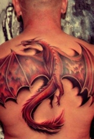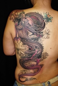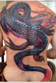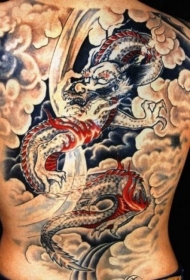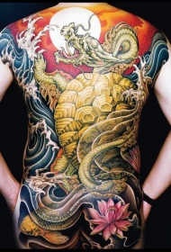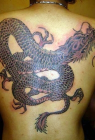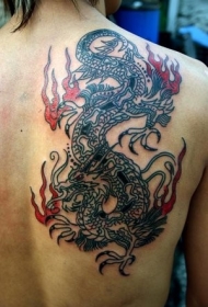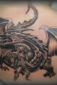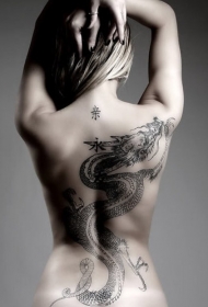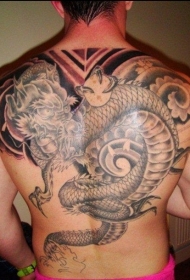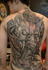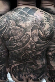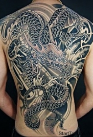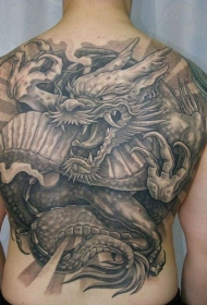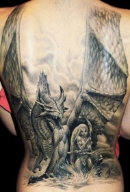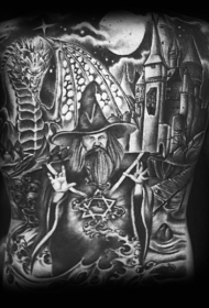 背部卡通般的黑白幻想世界巫师和龙纹身图案