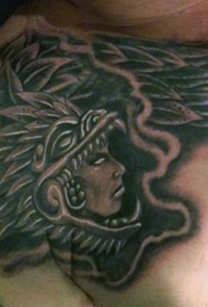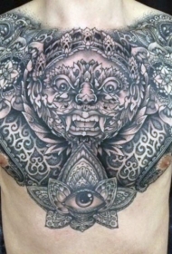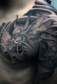 胸部和肩膀黑灰装饰花卉和幻想龙纹身图案