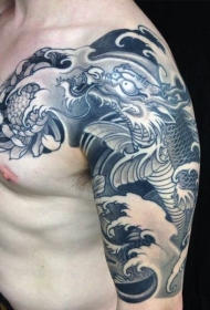 日本传统风格的黑色龙和菊花半甲纹身图案