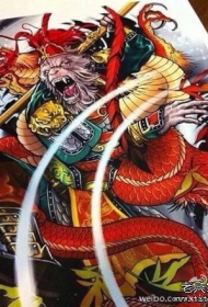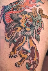 大腿上彩色传统羊头老虎和火龙纹身动物图片