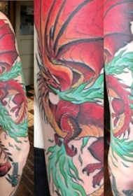 双大臂纹身 男生手臂上彩色的火龙纹身图片