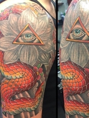 男子手臂上花朵纹身龙和上帝之眼纹身图片
