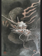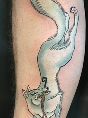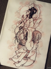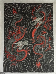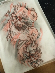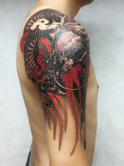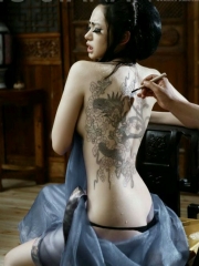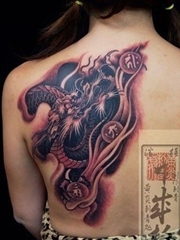 女性正背帅气的红火焰黑灰色龙纹身图片