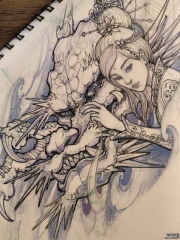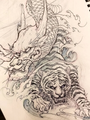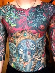 男士花臂斗战胜佛骷髅和龙纹身图案