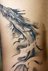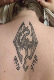 男生后背上黑灰点刺抽象线条小动物龙纹身图片
