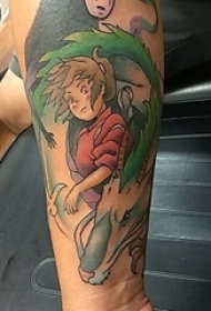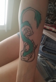 男生手臂上彩绘渐变简单线条卡通人物和龙纹身图片