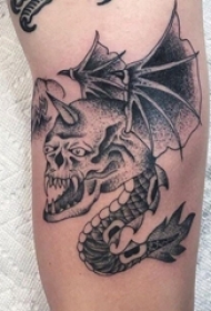 男生手臂上黑灰素描点刺技巧创意骷髅飞龙纹身图片