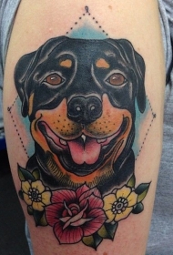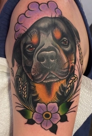 old school丰富多彩的罗威纳犬和花朵手臂纹身图案