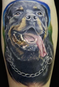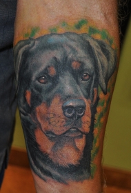 手臂绿色背景和写实的罗威纳犬纹身图案