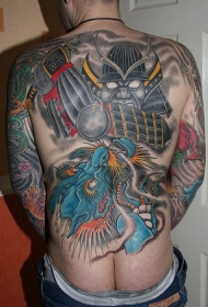 背部武士战斗龙彩色纹身图案